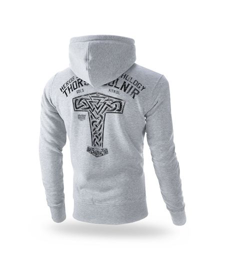 Толстовка с капюшоном и застежкой-молнией. Изготовлена из высококачественного хлопка, имеет два передних кармана и отделана ребристыми манжетами.Небольшая этикетка с логотипом бренда на левом рукаве. Капюшон украшен широким шнурком и фурнитурой с логотипом бренда. На спине — изображение молота Тора с надписью HEROS JOURNEY MYTHOLOGY THORS MJOLNIR и логотипом бренда. На передней левой стороне груди — миниатюрное изображение молота Тора.